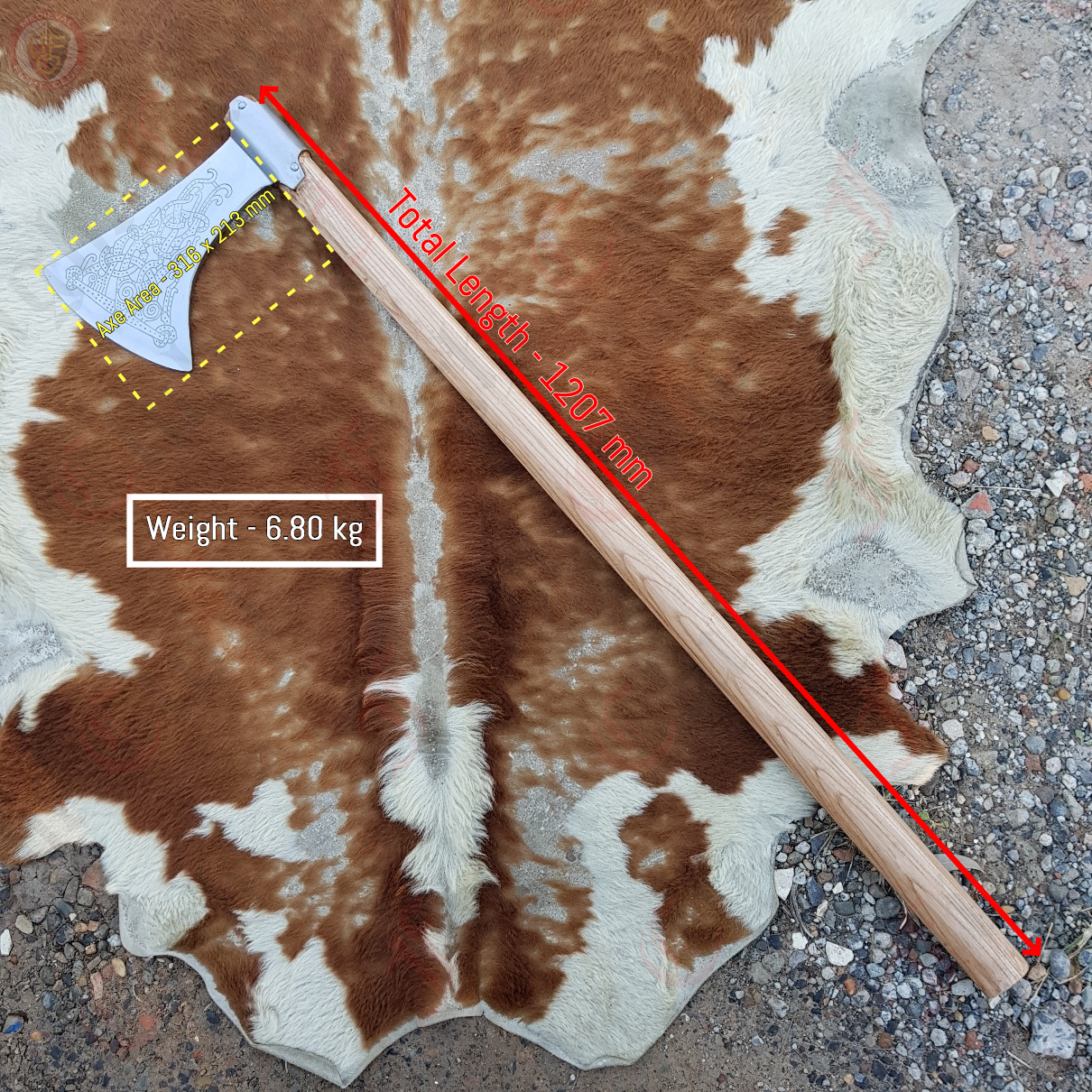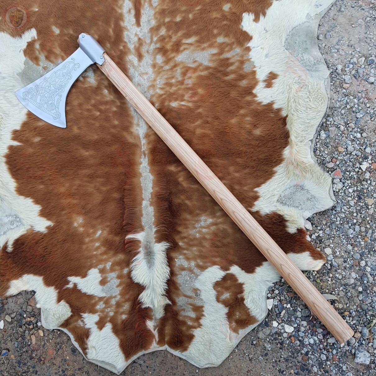 Dane axe with Viking era etching on both sides of the blade and includes a robust medium length haft. This is a beefy weapon designed to cut down through a man and his shield.