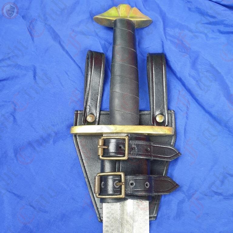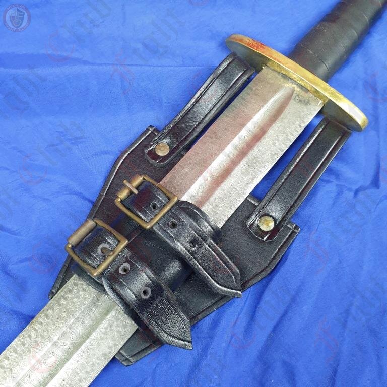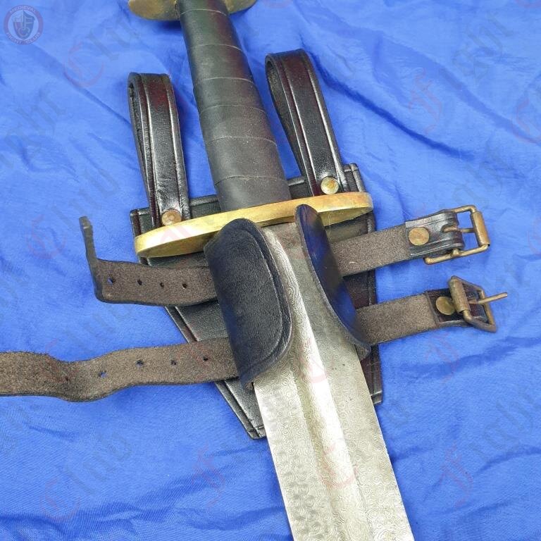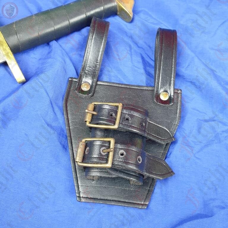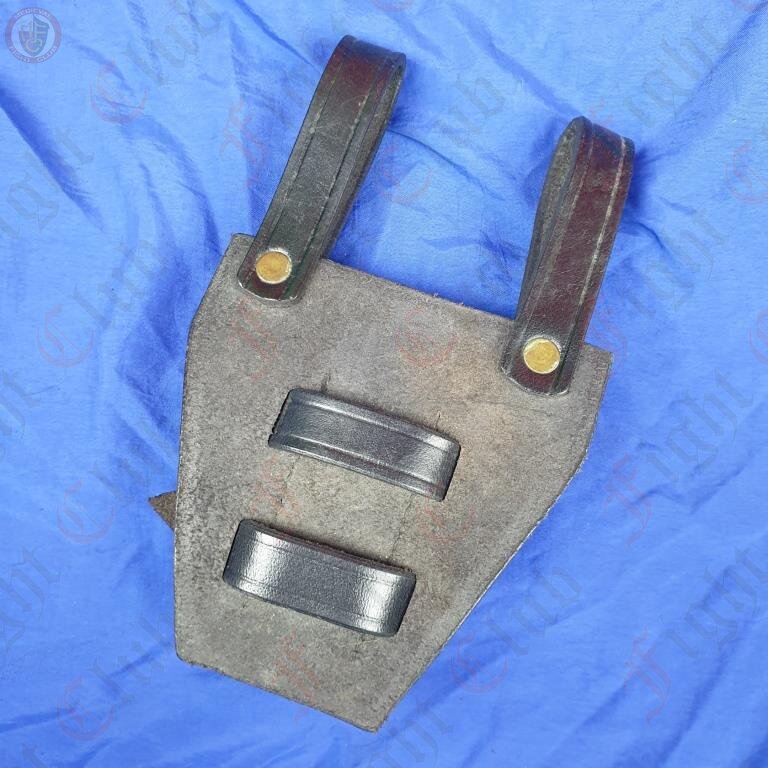 This one in particular is made of thick black leather, and nickle plated rivets and buckles. The fastener is adjustable in size, making this frog the perfect all rounder to fit any weapon you can fit off your hip.