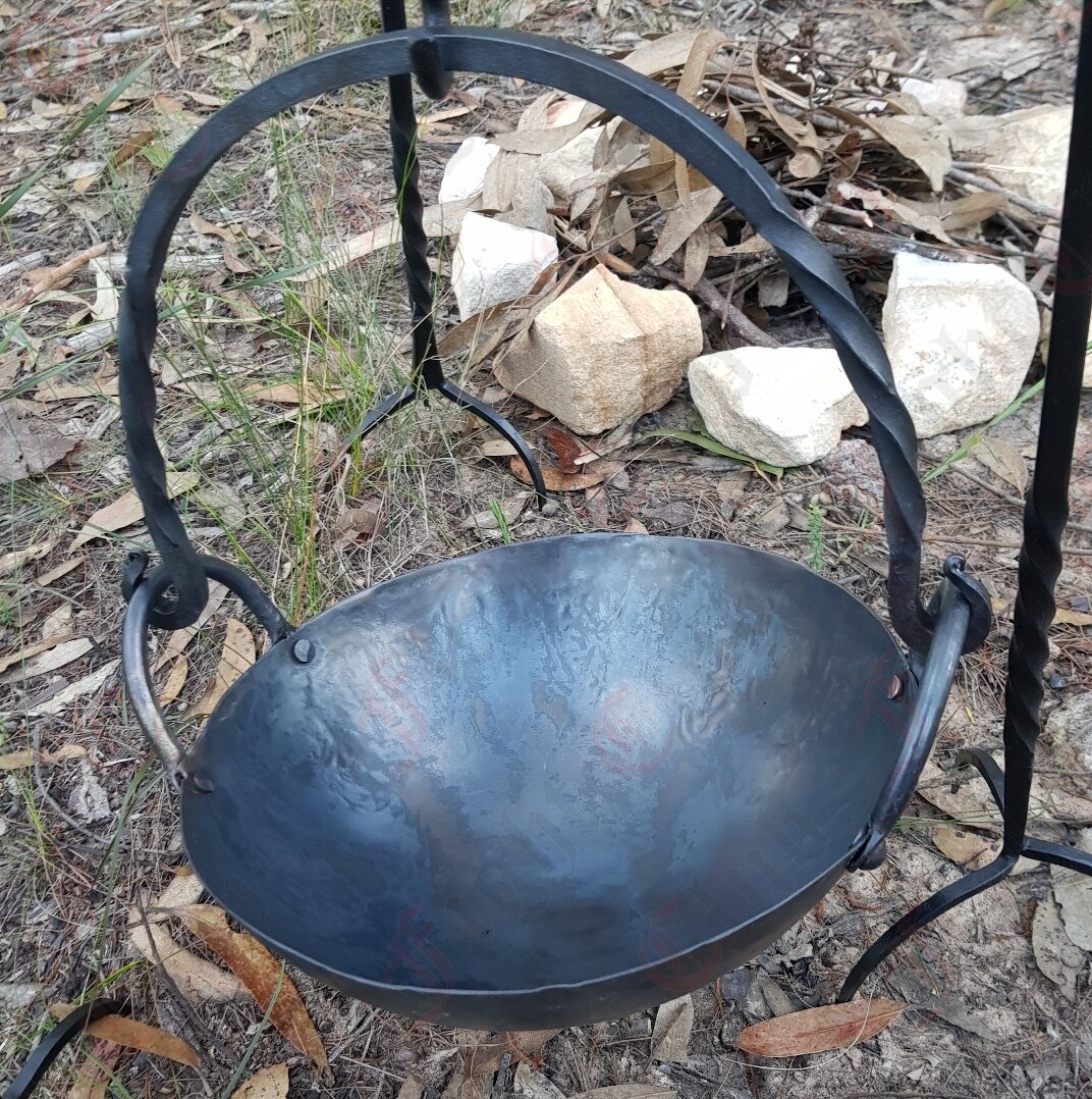 It is made from hand forged steel which makes it appropriate for re-enactment use. It features a curved handle which enables it to be easily attached to a tripod over a campfire or hung up out of the way when not in use.