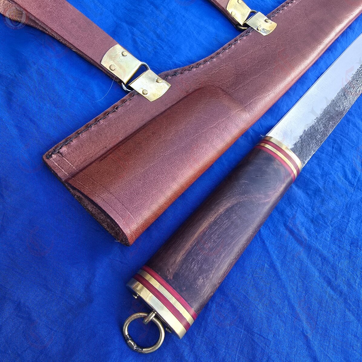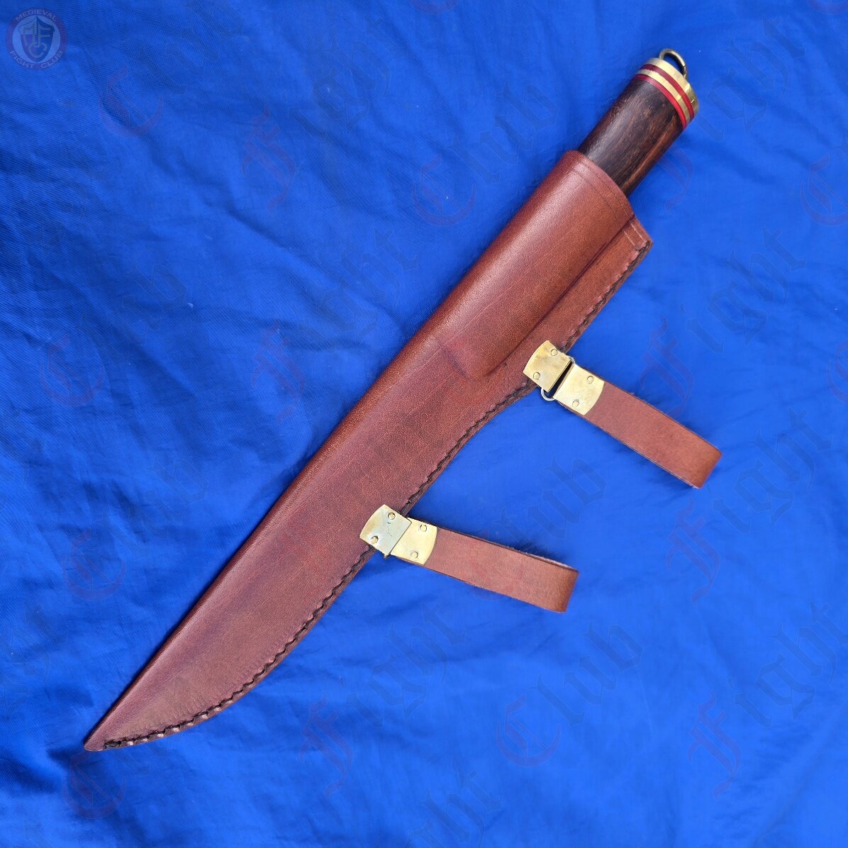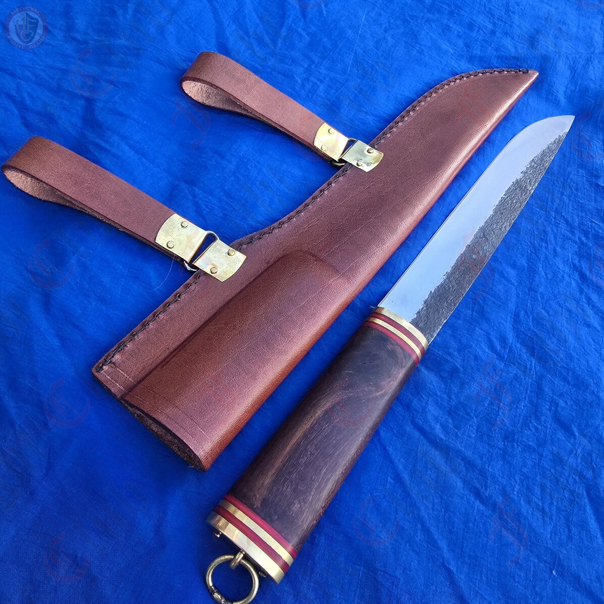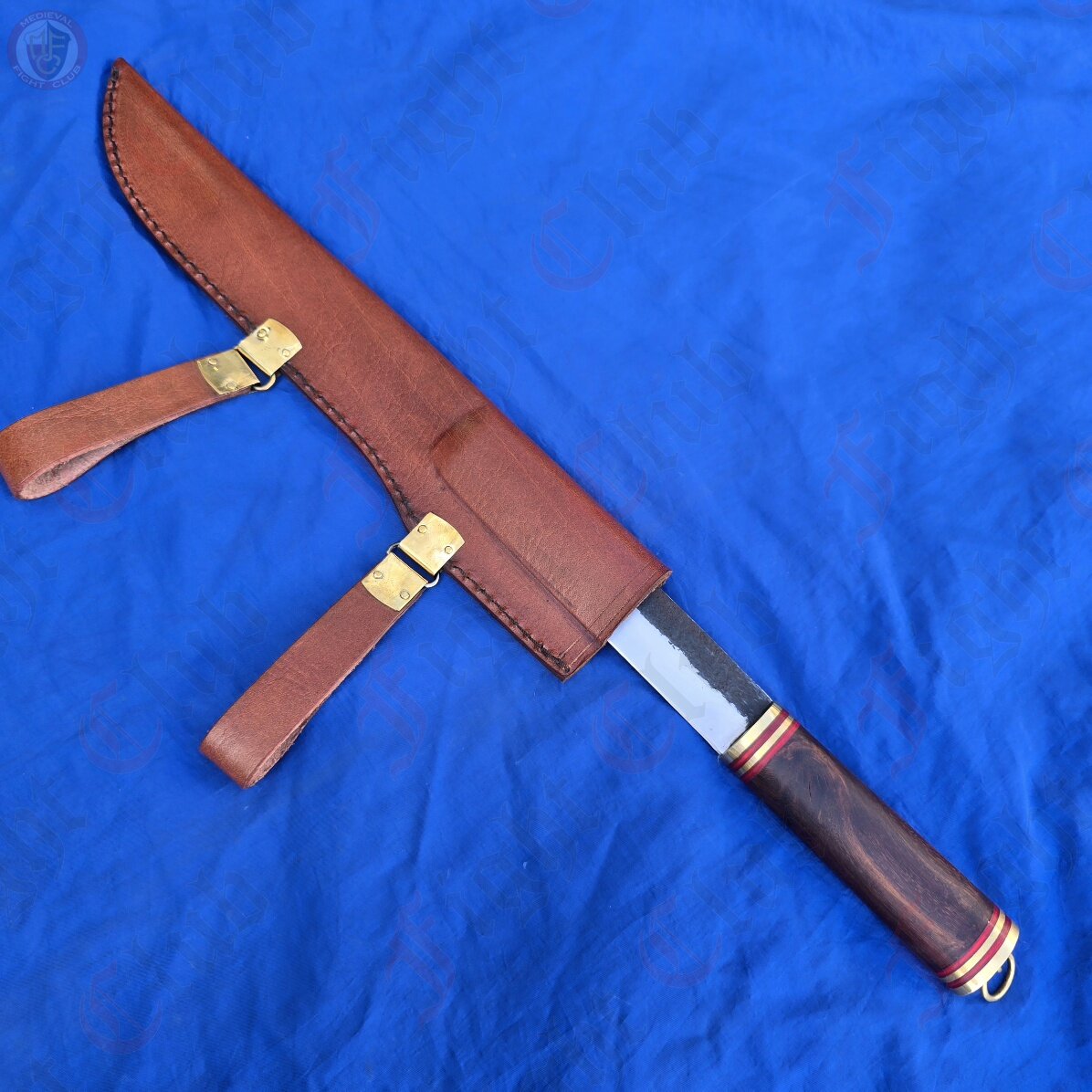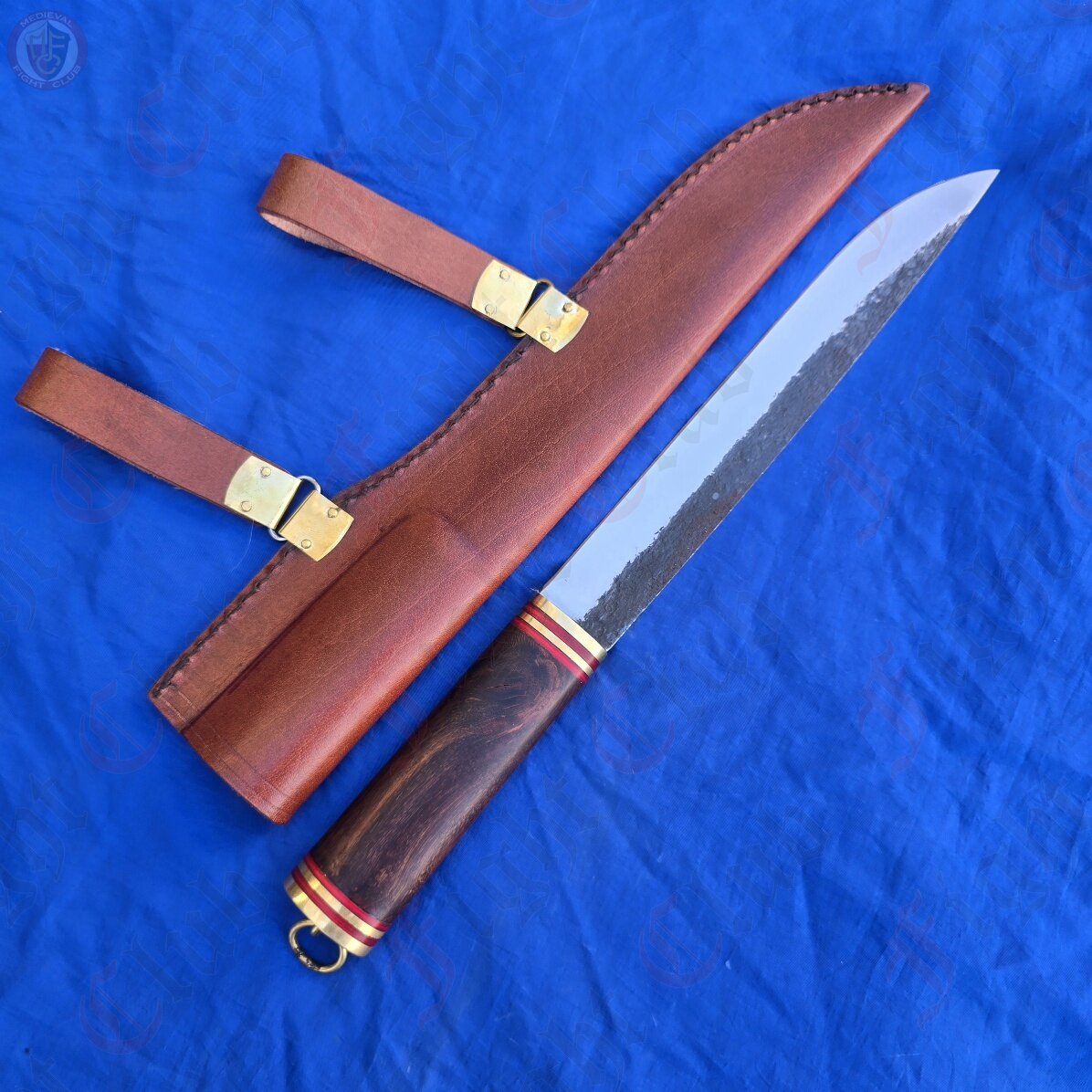 This particular seax is a standard, functional and rustic piece just ready to be picked up and used. With a sharp edge, this knife is practical and can be used just as it was a thousand years ago. It features a full tang, high carbon steel blade fitted to a polished wooden hilt and secured with brass end cap and accents. The hilt is decorated with bands of red stained wood that give this dagger a unique look and feel. It also comes with a fitted leather scabbard inside which the seax sits securely, and features two belt loops to attach to your waist.