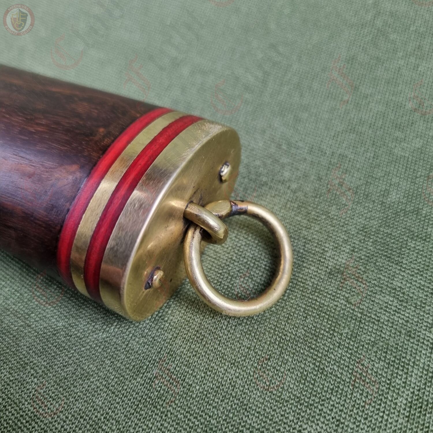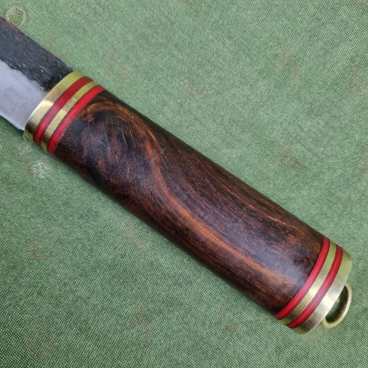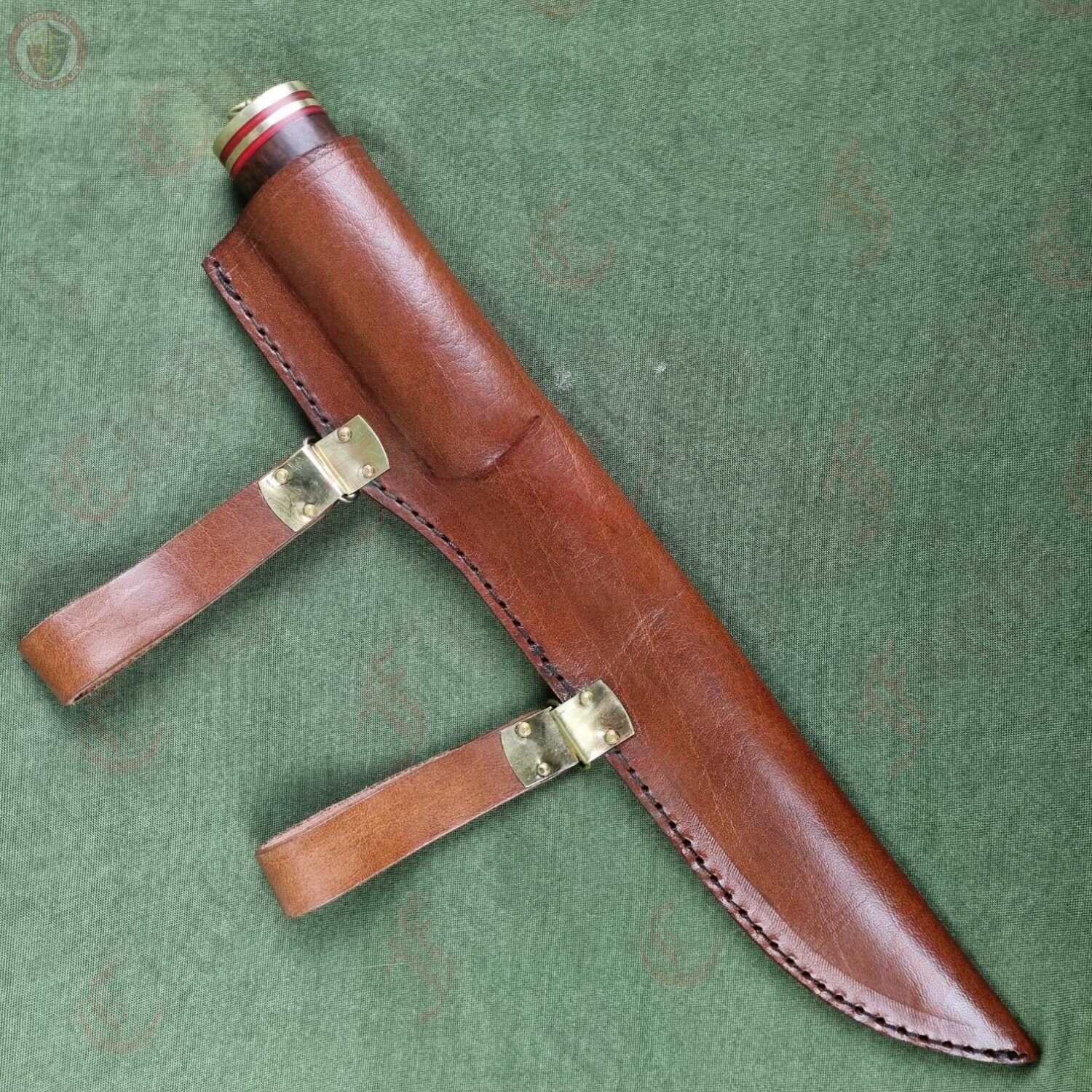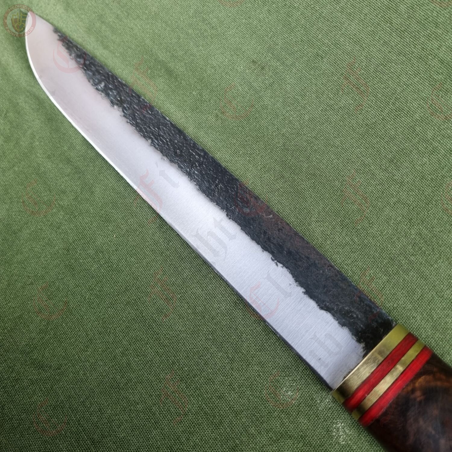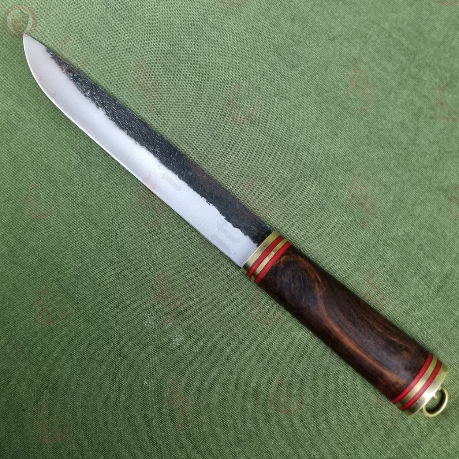 This particular seax is a standard, functional and rustic piece just ready to be picked up and used. With a sharp edge, this knife is practical and can be used just as it was a thousand years ago. It features a full tang, high carbon steel blade fitted to a polished wooden hilt and secured with brass end cap and accents. The hilt is decorated with bands of red stained wood that give this dagger a unique look and feel. It also comes with a fitted leather scabbard inside which the seax sits securely, and features two belt loops to attach to your waist.