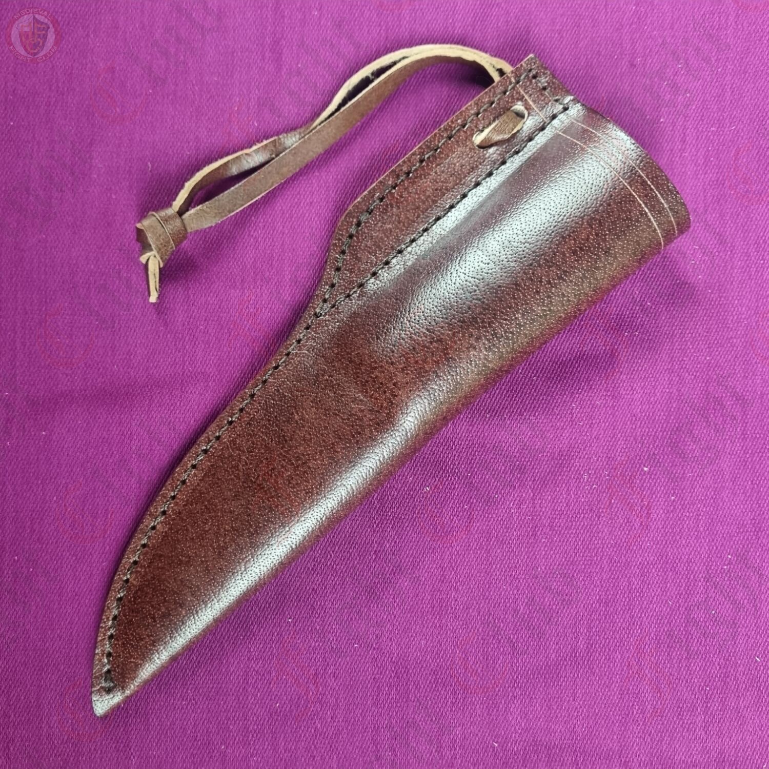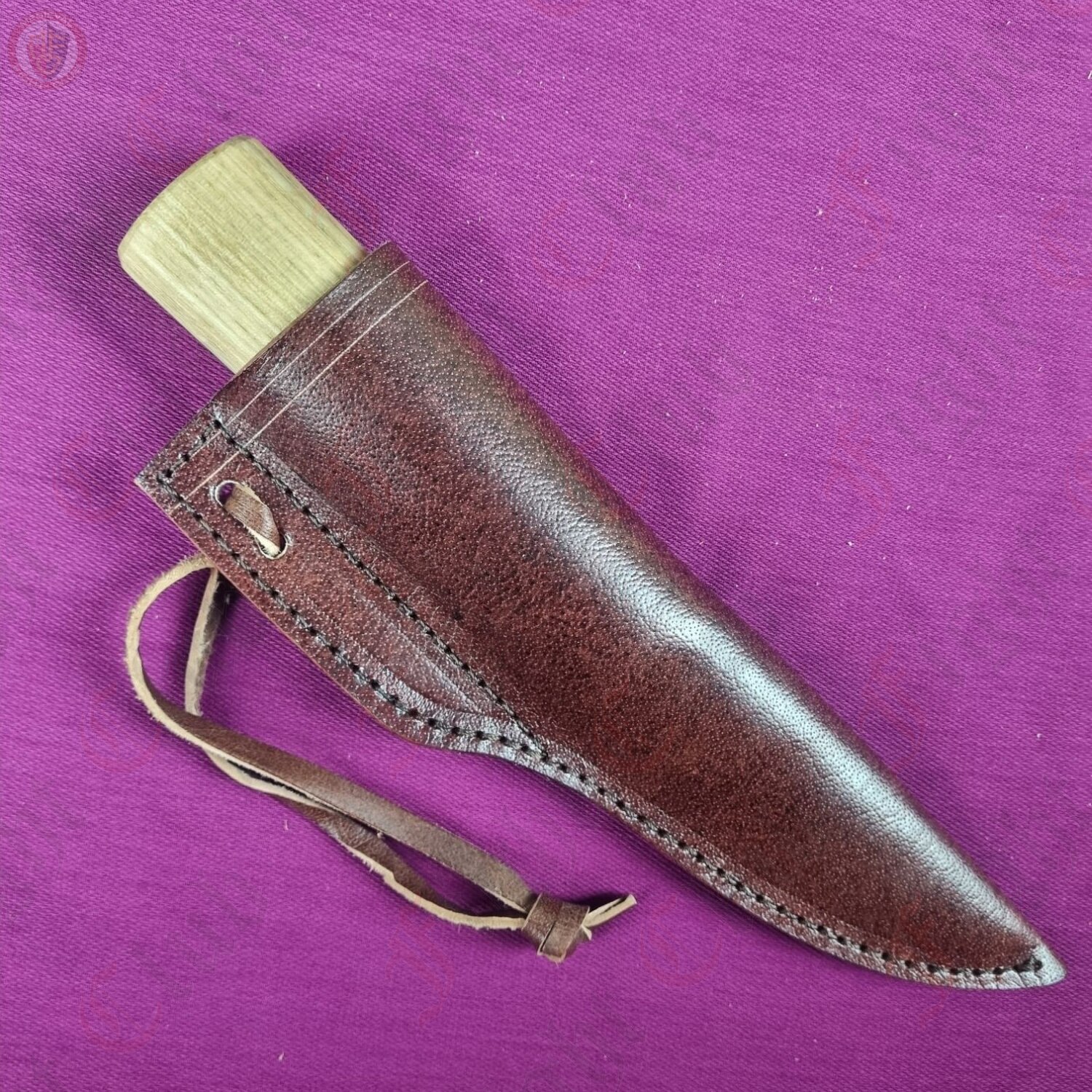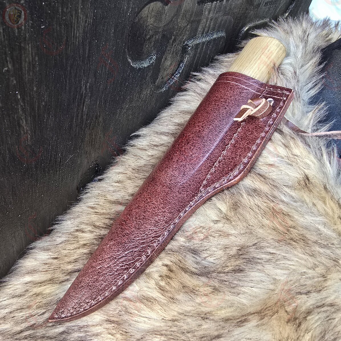 This particular seax is a standard, functional and rustic piece just ready to be picked up and used. With a sharp edge, this knife is practical and can be used just as it was a thousand years ago. It features a full tang, high carbon steel blade fitted to a sanded wooden hilt. The hilt features no decorations - letting you etch, burn or add to the blank slate as you see fit. Or, leave it blank and let the utility of the seax speak for itself. The knife also comes with a fitted leather scabbard inside which the seax sits securely, and features a leather loop for attaching to your belt.