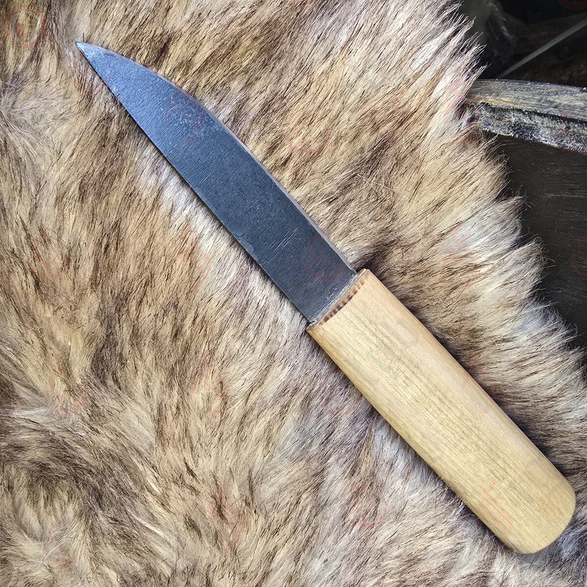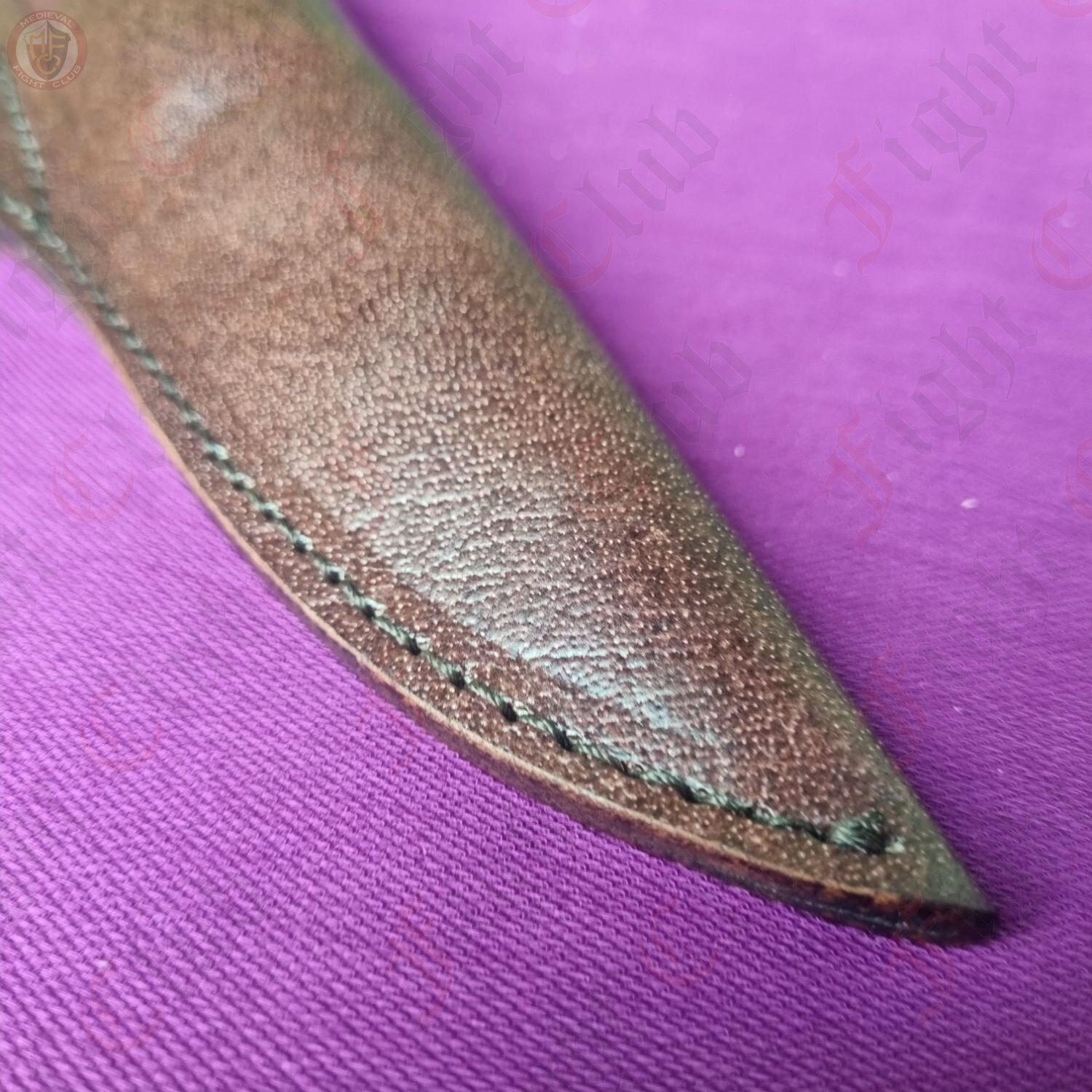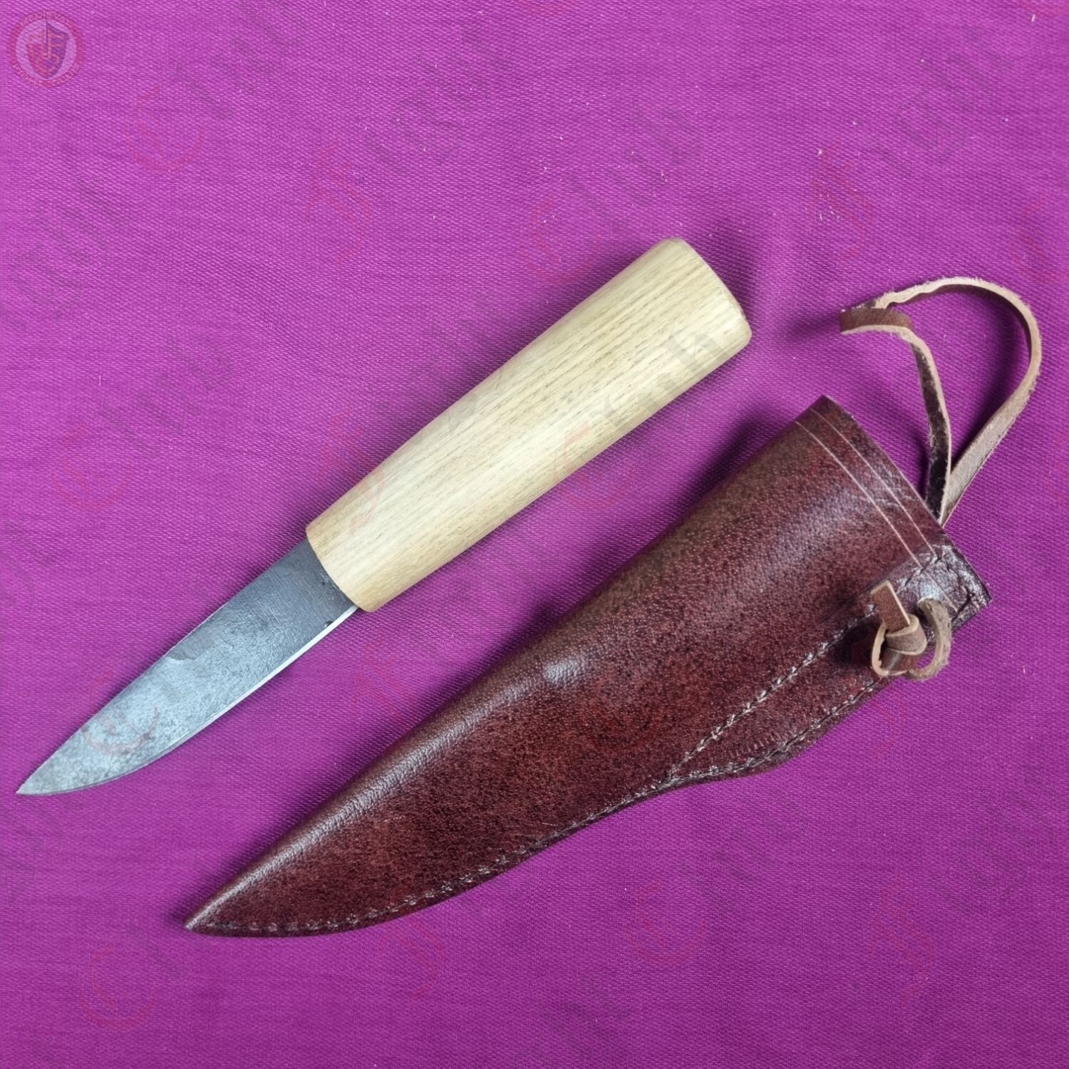 This particular seax is a standard, functional and rustic piece just ready to be picked up and used. With a sharp edge, this knife is practical and can be used just as it was a thousand years ago. It features a full tang, high carbon steel blade fitted to a sanded wooden hilt. The hilt features no decorations - letting you etch, burn or add to the blank slate as you see fit. Or, leave it blank and let the utility of the seax speak for itself. The knife also comes with a fitted leather scabbard inside which the seax sits securely, and features a leather loop for attaching to your belt.