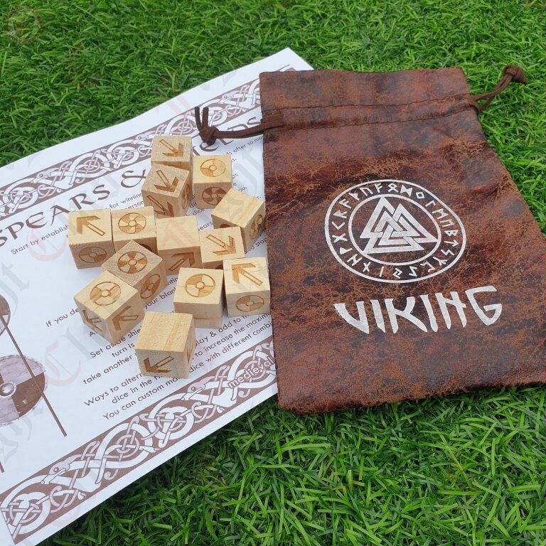 A game set includes a small pouch,13 Viking dice & suggested game rules in English and a version using Viking words.The use of Viking words in the context of a game can be a useful educational tool.