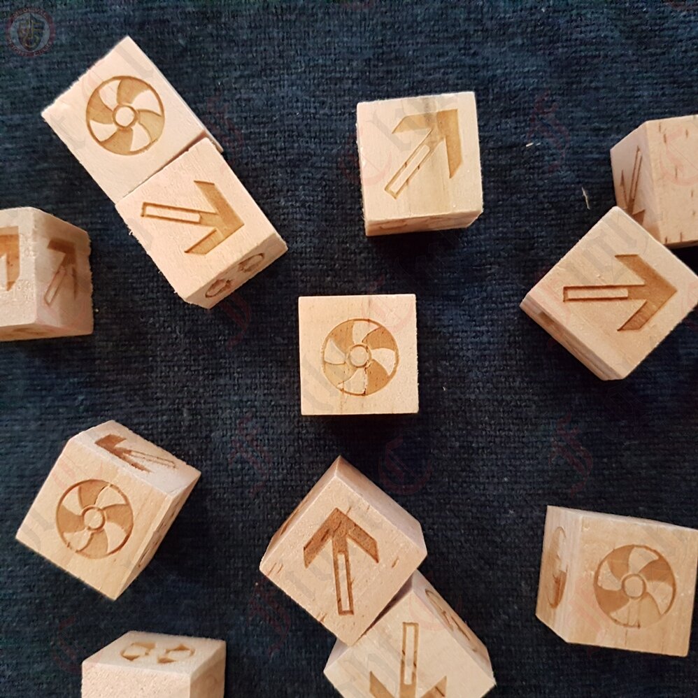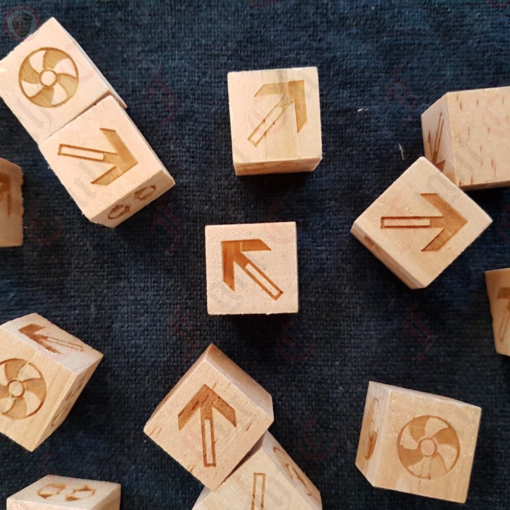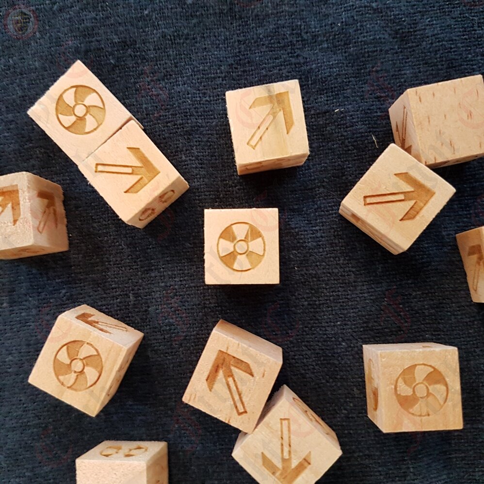 This wooden dice game set includes 13 Viking dice & suggested game rules in English.