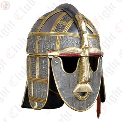 This plate is located around the crown of the helmet and on the cheek plates and is strikingly similar to ones found on Vendel helmets of the same era.