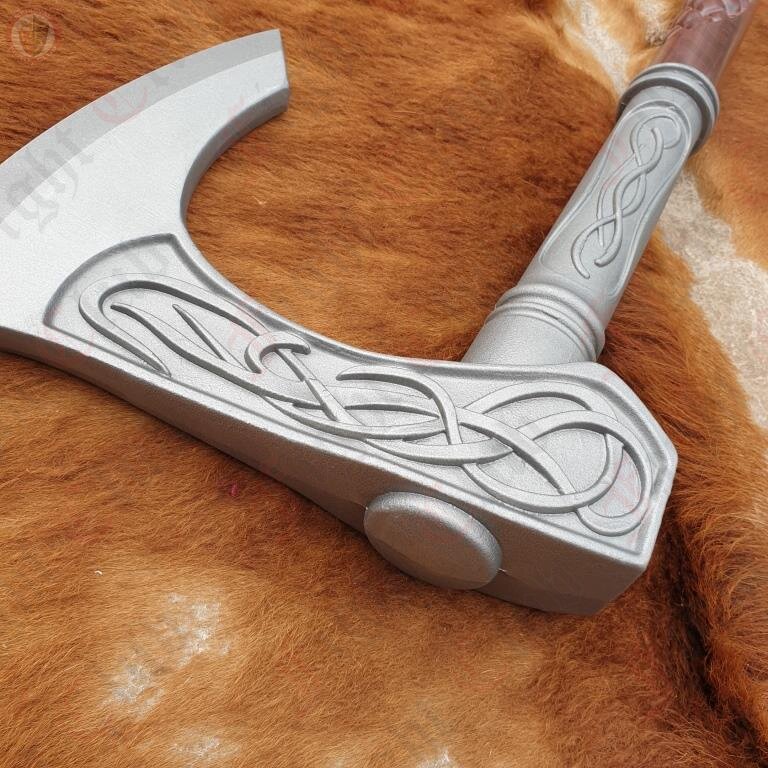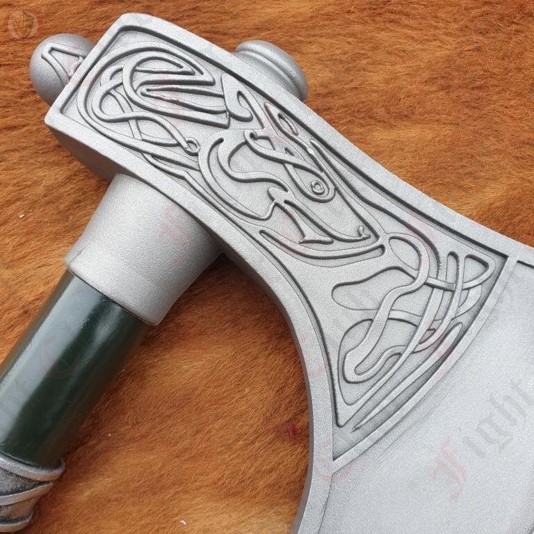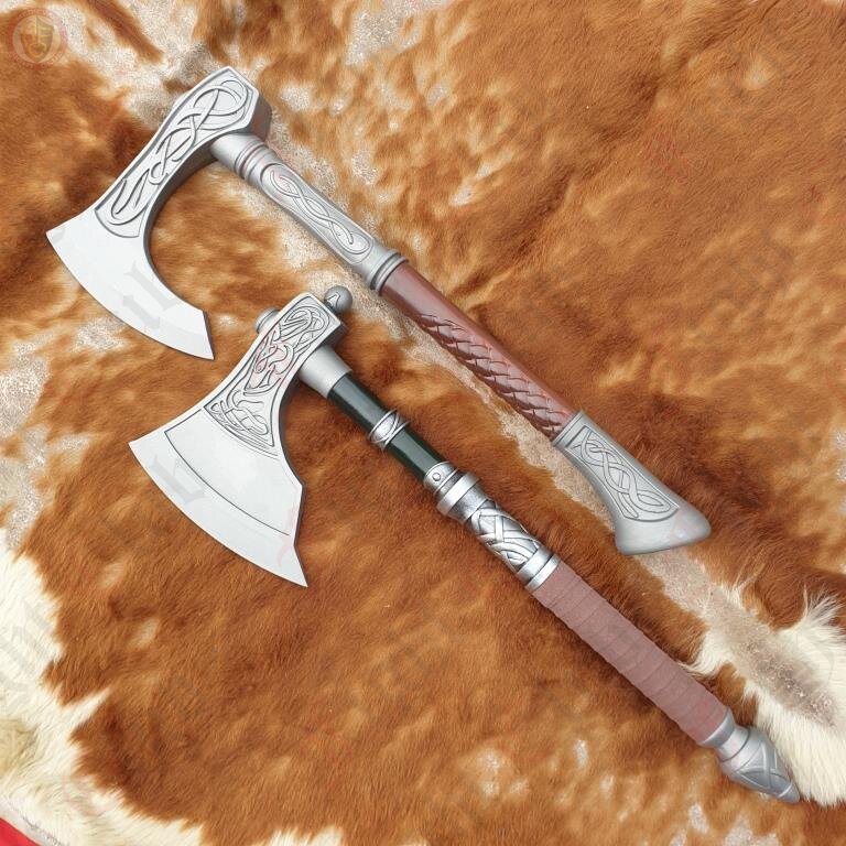 The Valhalla Axes are the perfect option - twinned steel axes for the warriors of Odin who don't need shields. Featuring the classic swirling patterning of the Norsemen along the blade faces and the haft, the axes are as deadly as they are pretty. Perfect for both hanging above your wall and crunching into your foe's skulls.