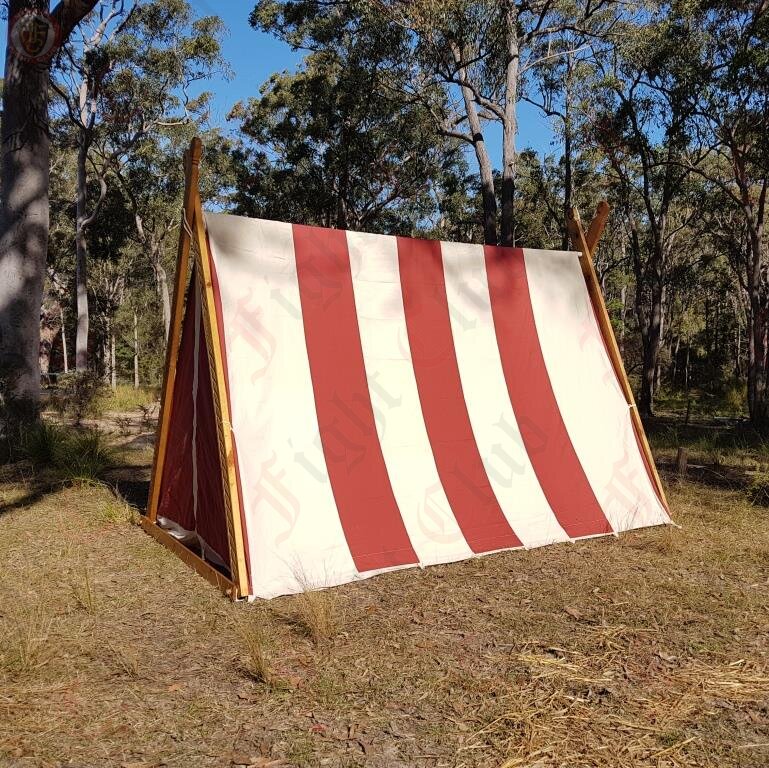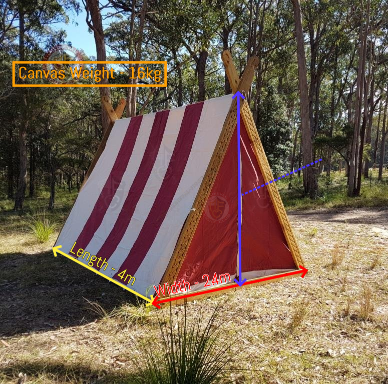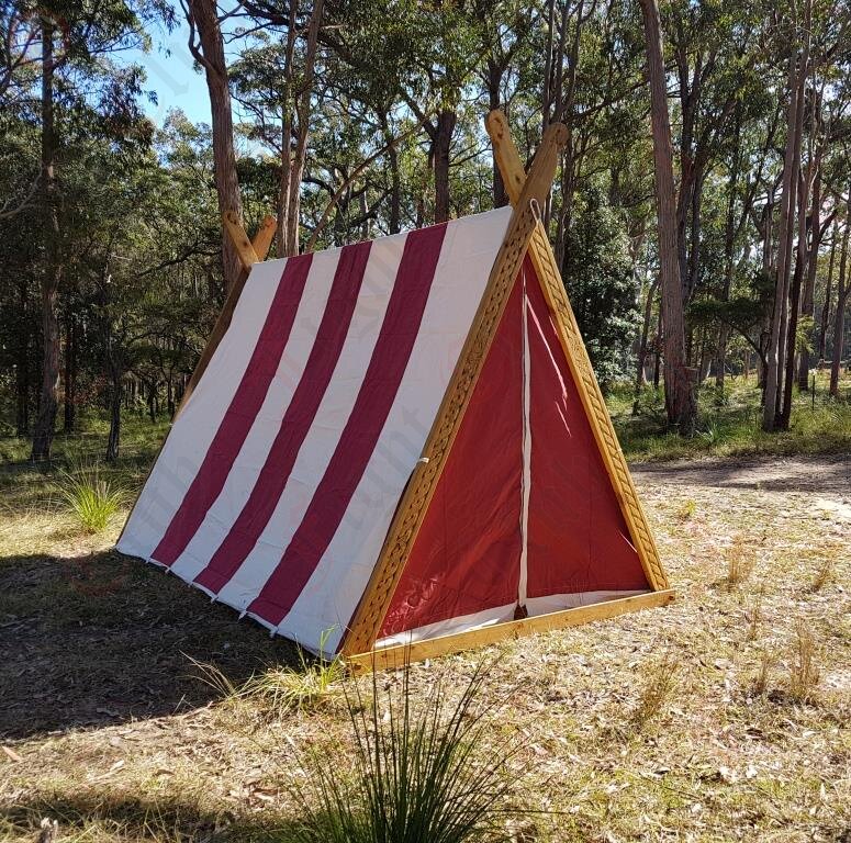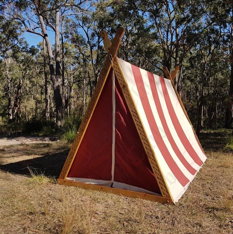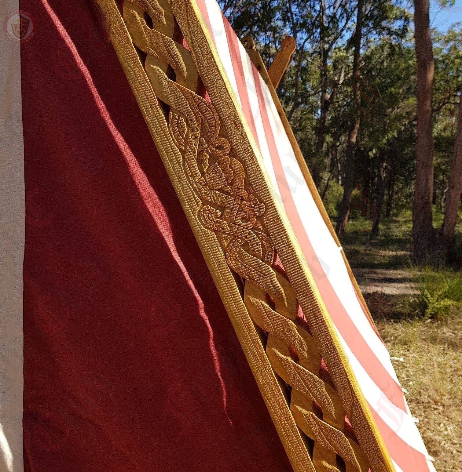 The basic design of this tent is drawn from the extant remains of tents uncovered during the excavation of the Gokstad and Oseberg 'Viking' ship (dated around 800 AD) burials during the the period 1880-1905. While the remains of the latter have since deteriorated, original archeological catalogs provide information on the basis of the construction. Examples of the vertical gable board from the Gokstad also suggest a more prolific nature of the tent design throughout Norway and perhaps greater Scandinavia, as well as providing another splendid example of the distinctive craftsmanship and animal motifs of 'Viking age' Scandinavian art.